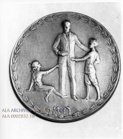 Photograph of one side of the Newbery Medal. To view both sides of the medal, refer to image ALA0002831.
