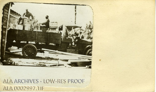 Two soldiers sitting in the back of a truck loaded with boxes, with another soldier sitting in the driver's seat.