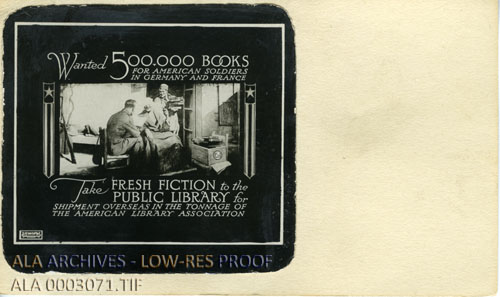 An ALA book campaign advertisement calling for donations for American soldiers in Germany and France. It reads, "Wanted 500,000 books for American soldiers in Germany and France. Take fresh fiction to the public library for shipment overseas in the tonnage of the American Library Association."