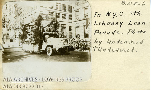 Caption on the side reads: "In N.Y.C. Sth. Library Loan Parade. Photo by Underwood & Underwood."