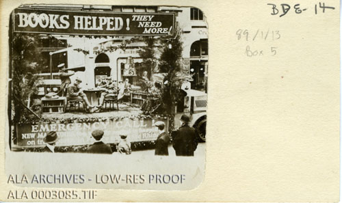 A book campaign float from the ALA War Service in a New York City parade in 1919.