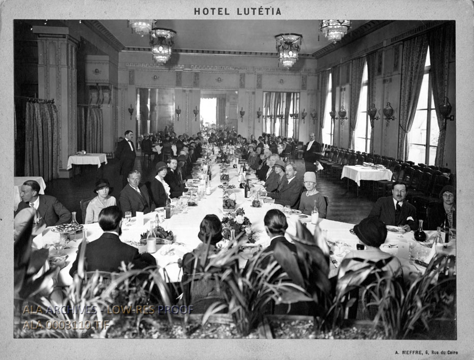 Group of American librarians having lunch in Paris, France, at the Hotel Lutetia, hosted by l'Office Central de Librairie et de Bibliographie.