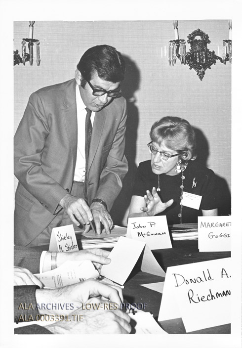 Members of the Reference Services Division working during the 1971 Midwinter Meeting in Los Angeles. Pictured are John McGowan and Margaret Goggin.
