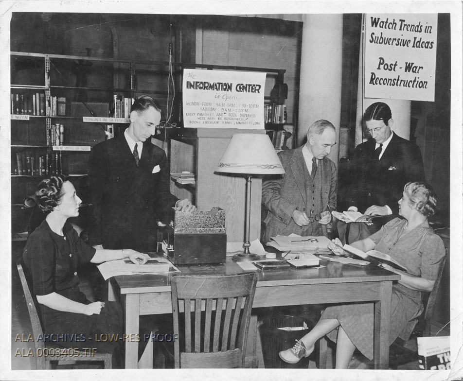 A group of people at the War Information Center desk at the University of North Carolina in Chapel Hill.