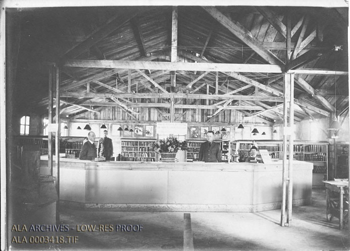 The reference desk of an unknown camp library during World War I.