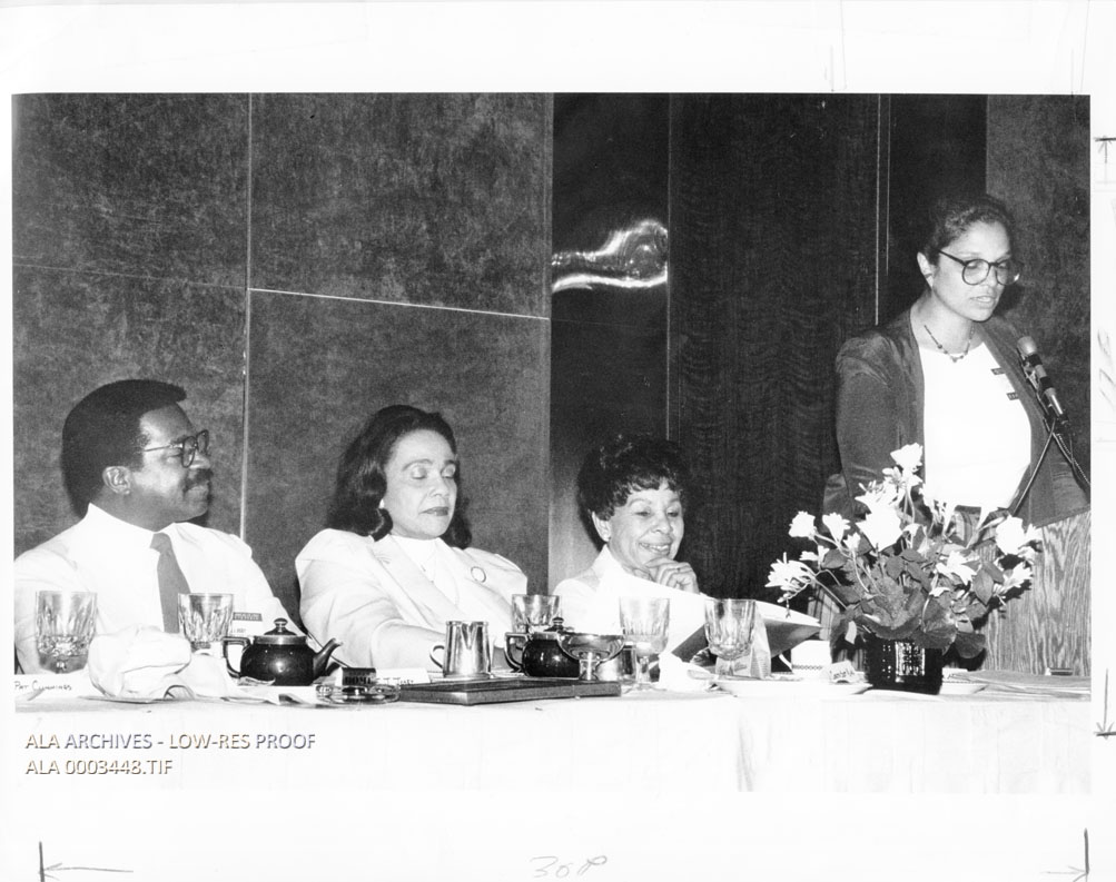Pat Cummings giving her acceptance speech at the Coretta Scott King Award gala breakfast event at the 1984 Annual Conference at Dallas. Seated from left to right are E. J. Josey, Coretta Scott King, and Effie Lee Morris.