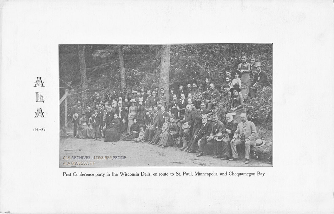 Group photograph of conference attendees of the 1886 ALA Annual Conference at Milwaukee, Wisconsin, attending a post conference party in the Wisconsin Dells.