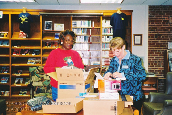 Staff from Troy Public Library in Alabama, Addie Green, head of circulation, and Director Margaret Stewart, unpack wireless computer hardware provided by the Beaumont Foundation of America.