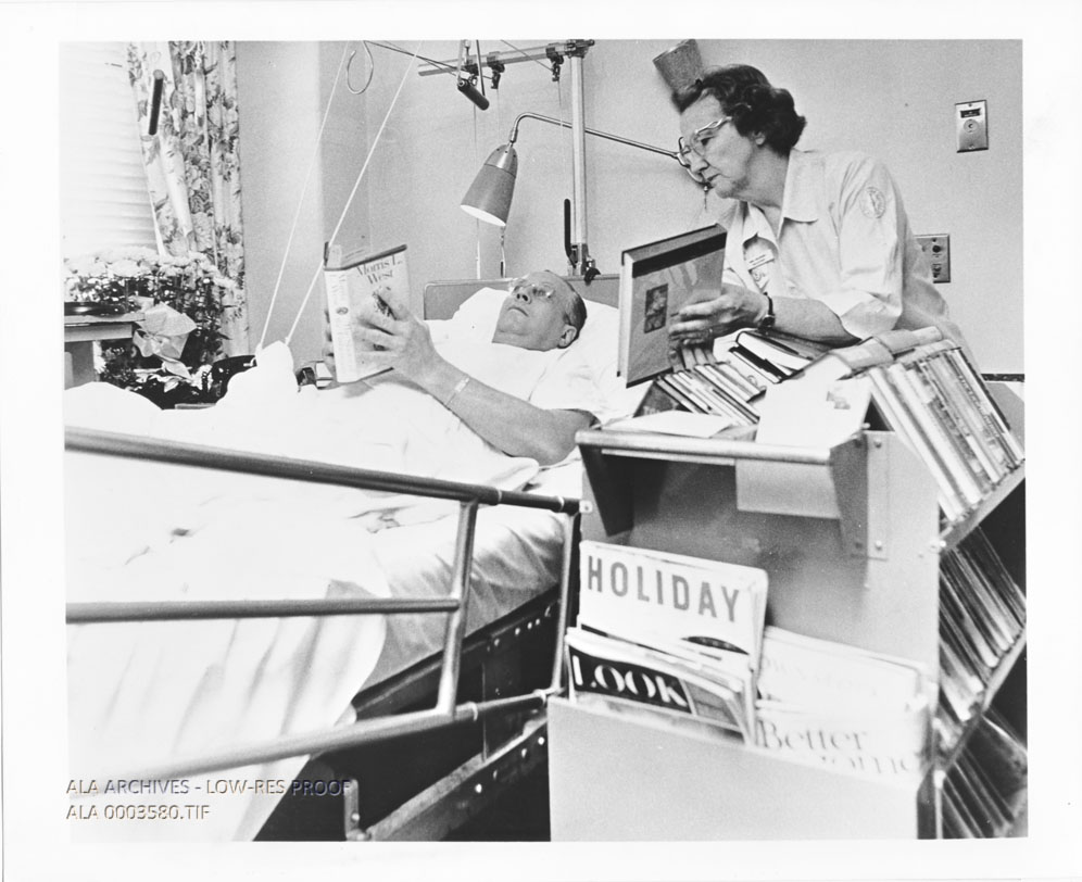Bedside library services via book cart to patient at the Presbyterian-St. Luke's Hospital in Chicago, Illinois.