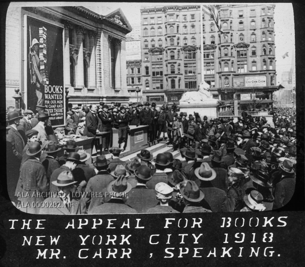 Glass plate slide showing a crowd gathered around the steps of the New York City public library to hear an appeal for book donations for American service personnel. The speaker is likely Henry Carr, Executive Director of the ALA.