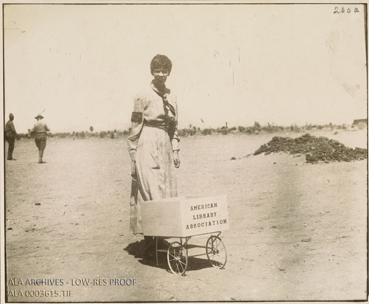 Anne M. Mulheron, a base hospital librarian at Camp Cody, New Mexico, with an American Library Association box.