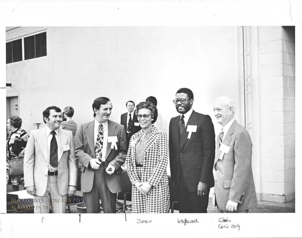 Photograph of members of ALA's executive board. From left to right: Unidentified man; Eric Moon (president elect); Clara Jones (president); Robert Wedgeworth (executive director); Chris Hoy (former executive director).