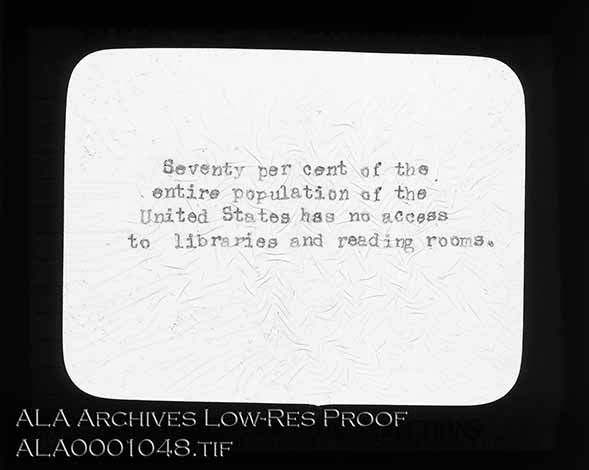Glass plate advertising the 'Books for Everybody' fund. Caption reads: "Seventy percent of the entire population of the United States has no access to libraries and reading rooms."