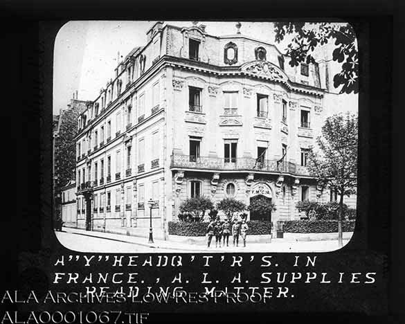 Glass plate showing the YMCA headquarters in France. Caption reads: "A 'Y' Headq't'r's. In France. ALA Supplies reading matter."