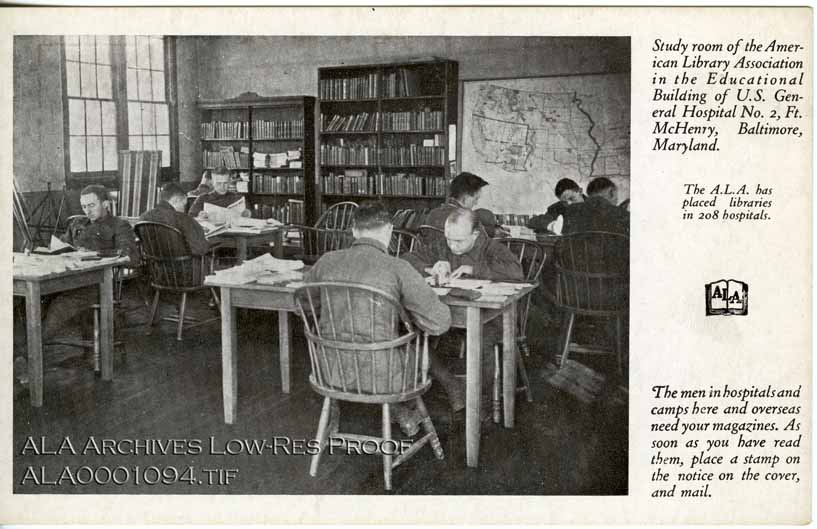 Postcard caption reads: Study room of the American Library Association in the Educational Building of the U.S. General Hospital No. 2, Ft. McHenry, Baltimore, Maryland.
