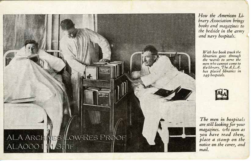 Postcard caption reads: How the American Library Association brings books and magazines to the beside in the army and navy hospitals.