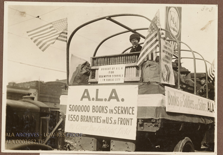 American Library Association parade float with servicemen riding inside for the United War Work Campaign; Kansas City, November 9, 1918. Also see image ALA0001278