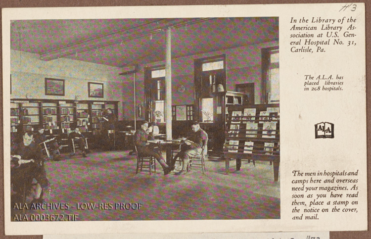 Postcard caption reads: In the Library of the American Library Association at U.S. General Hospital No. 31, Carlisle, Pa.
