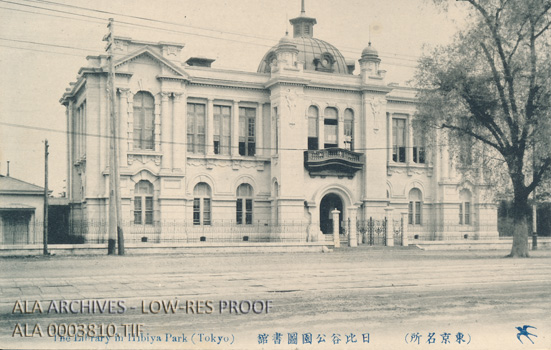 Postcard of the library in Hibiya Park in Tokyo, Japan.