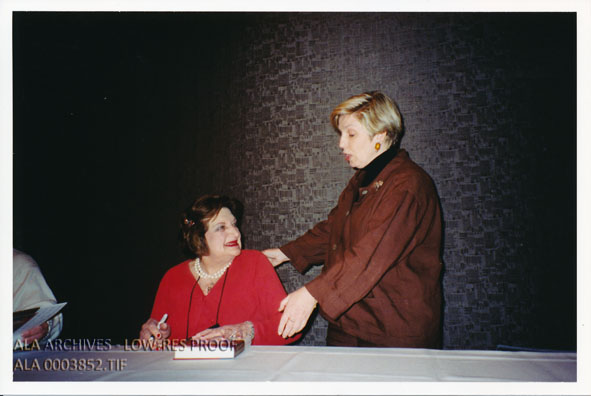 Journalist Helen Thomas signs her book for Public Library Association President-elect Jo Ann Pinder at the 2002 Public Library Association Conference in Phoenix, Arizona.