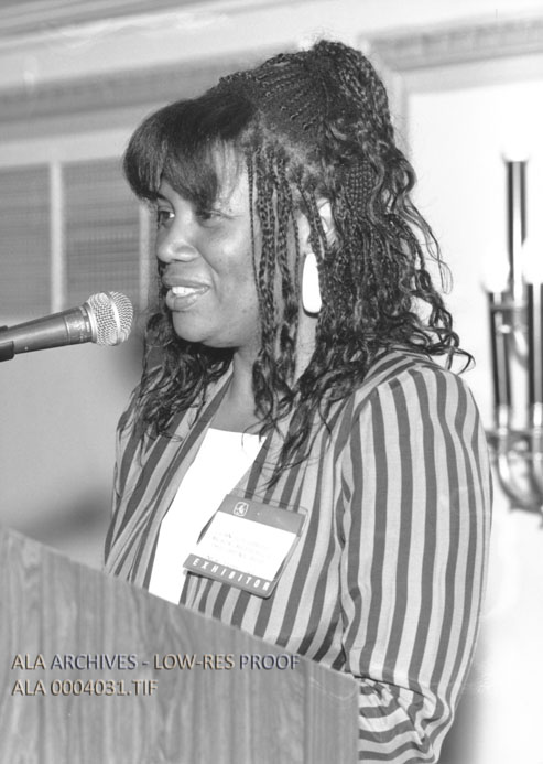 Photograph of Jan Spivey Gilchrist speaking at the Coretta Scott King Book Awards.