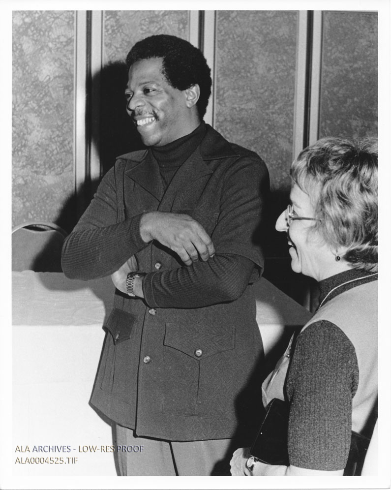 Photograph of Tom Feelings, Caldecott Medal winner, at the 1975 Newbery-Caldecott Awards. Ethel Heins is to the left.