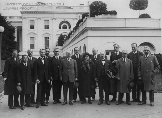 Caption on the back reads: A.G. Drachmann, Copenhagen; K. Matsumoto, Tokyo; Dr. Hugo Kruss, Berlin; Camille Gaspar, Brussels; Ernest A. Savage, Edinburgh; Eugene Morel, Paris; Andre Bovet, Neuchatel, Switzerland; Professor Vincenzo Fago, Rome; Madame L. Haffkin Hamburger, Moscow; Dr. Isak G.A. Collijn, Stockholm; R.J. Gourley, Belfast; Thor Anderson, Osla, Norway; Senor don Basilio Bulnes, Mexico; Dr. Jacob ter Meulen, The Hague; Henry Guppy, Manchester, England, foreign delegates at the Fiftieth Anniversary of the American Library Association, photographed at the White House when they called to pay their respects to President Coolidge.
