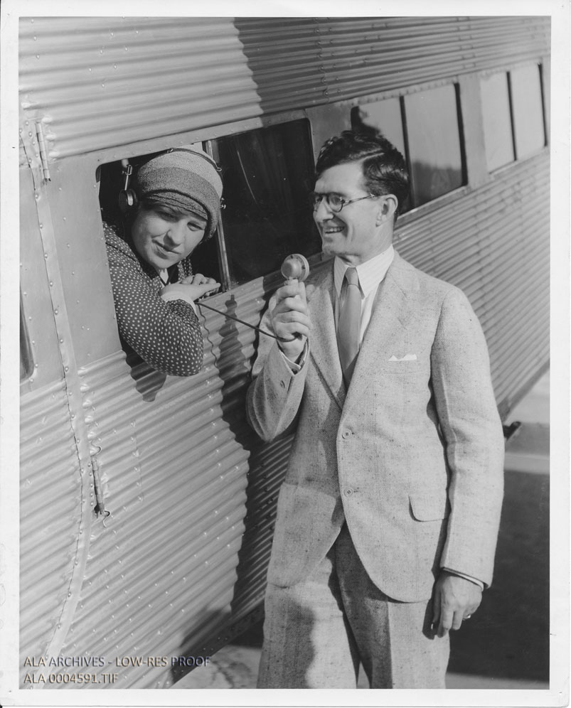 Author Rachel Field with her head out of a window and California state librarian Milton Ferguson announcing Field's Newbery Medal award.