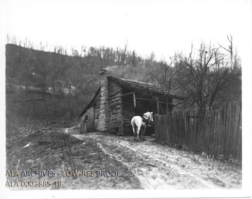 Courier visiting mountain home on a WPA pack horse in Knott County, Kentucky.