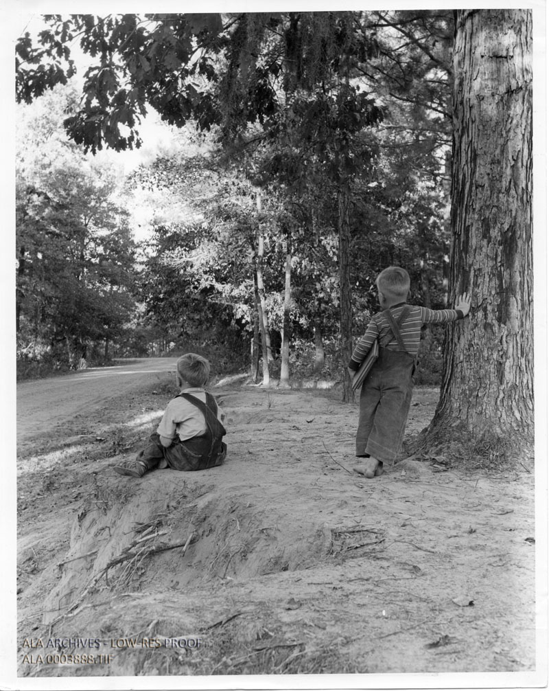 Photograph of two children outside and waiting for the bookmobile to arrive in Louisiana.