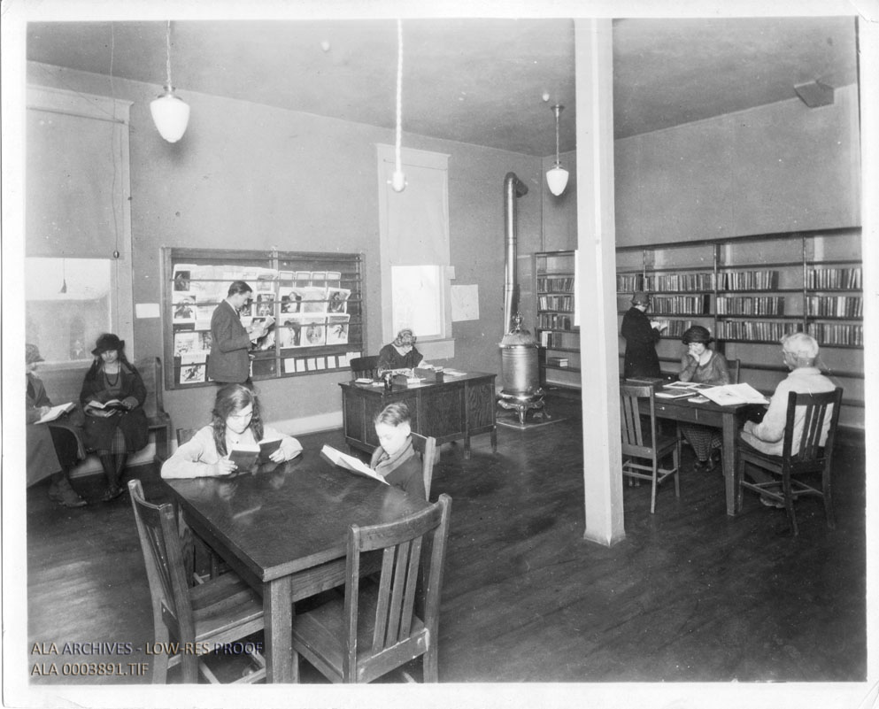 Photograph of the interior of a village branch of a county library with patrons in Allen County, Indiana.
