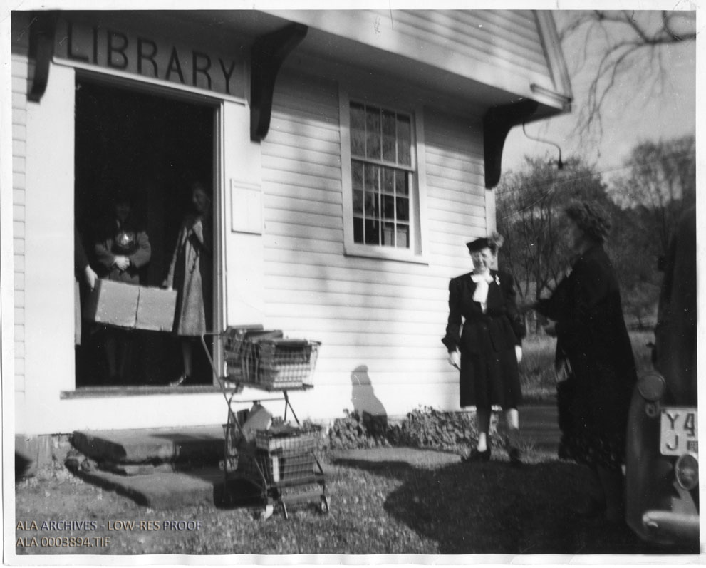 Photograph of Connecticut "Swap Groups", with librarians with their books outside of a library.