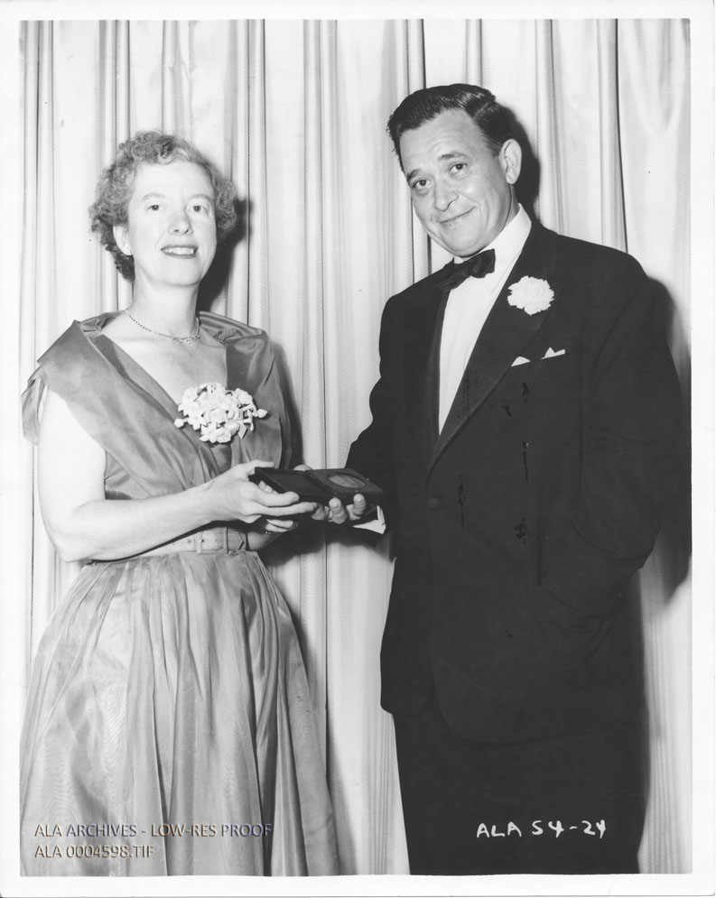 Photograph of Virginia Haviland presenting author Joseph Krumgold with the Newbery Medal at the 1954 Annual Conference.
