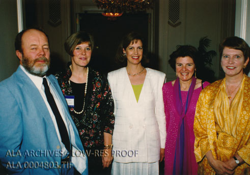 Newbery winner and honorees at the 1990 Newbery-Caldecott Banquet. From left to right: Gary Paulsen (Newbery honoree), Suzanne Fisher Staples (Newbery honoree), Janet Taylor Lisle (Newbery honoree), Caroline Ward (Newbery chair), and Lois Lowry (Newbery winner).