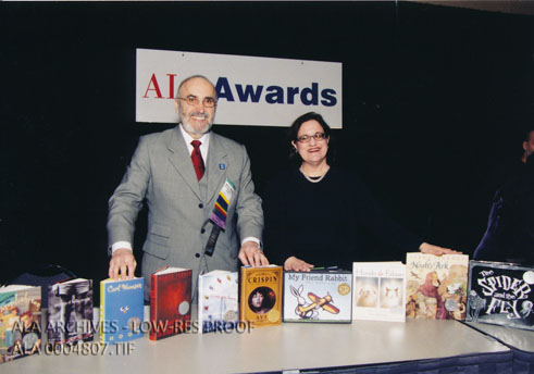 Caption on the back reads: ALA President Mitch Freedman and ALSC President Barbara Genco show off winning 2003 Newbery and Caldecott books at ALA's youth media award press conference Monday, January 27, 2003 in Philadelphia.