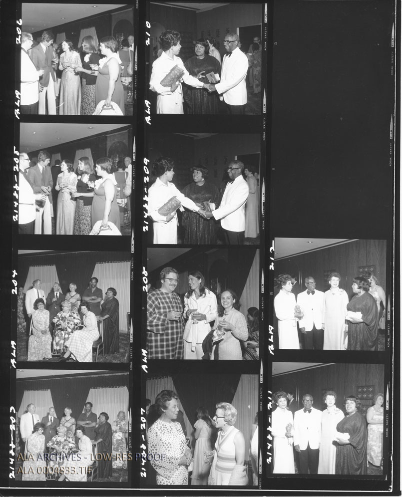 Contact sheet of negatives from the 1975 Newbery-Caldecott Banquet. Includes images of Spencer Shaw, Barbara Rollock, Effie Lee Morris, and Clara Stanton Jones.