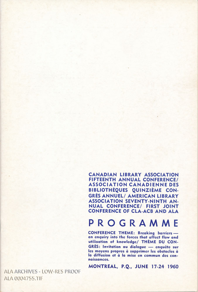 Program cover from the 79th Annual Conference. This was the first joint conference held with the Canadian Library Association in Montreal, Canada from June 17-24, 1960. The image contains French and English translations of the Canadian Library Association 15th Annual Conference, and the theme of the conference.
