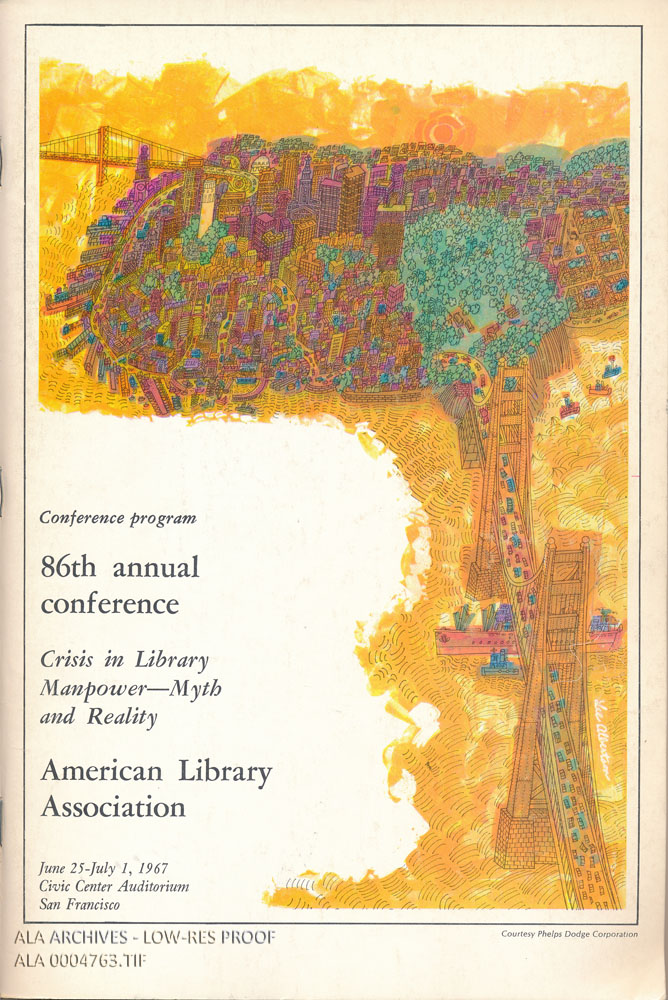 Program cover from the 86th Annual Conference. Held at the Civic Center Auditorium in San Francisco, California from June 25-July 1, 1967. The theme for this conference was "Crisis in Library Manpower - Myth and Reality."