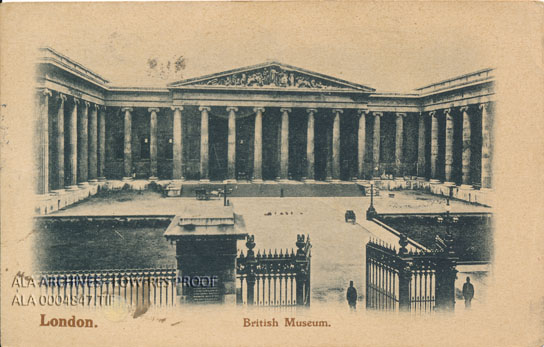Caption on the back reads: Founded in 1870. Contains the most notable collection in the world, of books, manuscripts, prints, drawings, etichings, medals, coins, ancient and mediaeval antiquities and sculpturs &c.