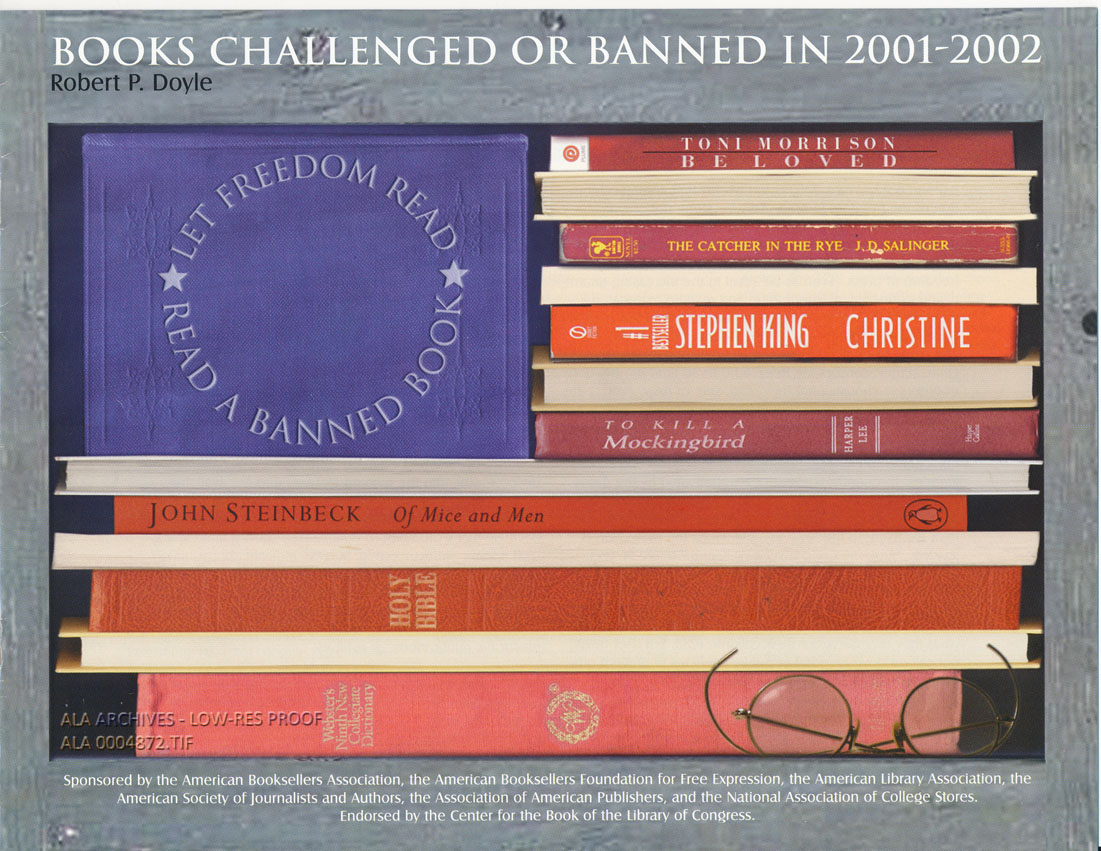 The cover of Books Challenged or Banned in 2001-2002 list by Robert P. Doyle.