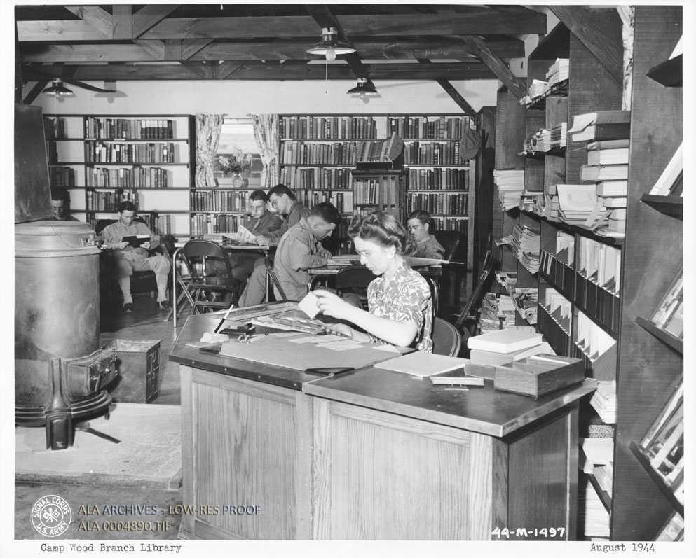 Caption on the bottom reads: "Camp Wood Branch Library" Found in RS 89/2/6, Box 5, Folder: Post Library, Fort Monmouth, NJ