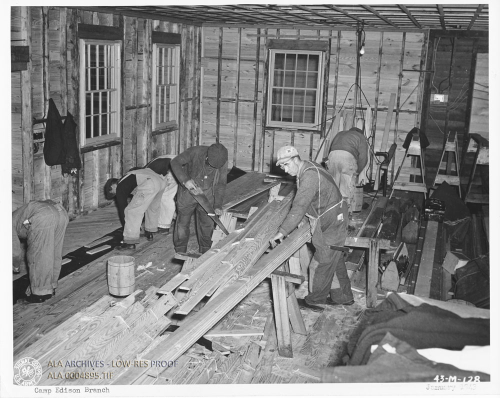 Construction of the Camp Edison Library, a branch of the Fort Monmouth Post Library. Caption on the bottom reads: "Camp Edison Library"