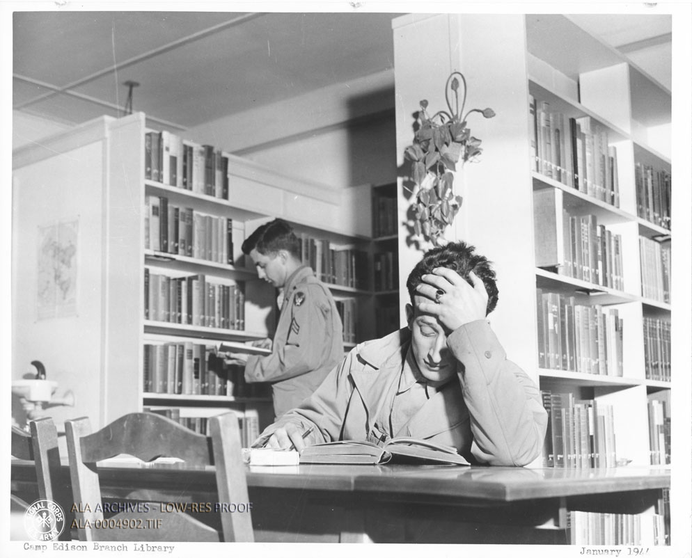 Servicemembers reading in the Camp Edison Branch Library. Caption on the bottom reads: "Camp Edison Branch Library"