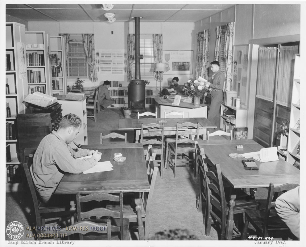 Servicemembers reading in the Camp Edison Branch Library. Caption on the bottom reads: "Camp Edison Branch Library"
