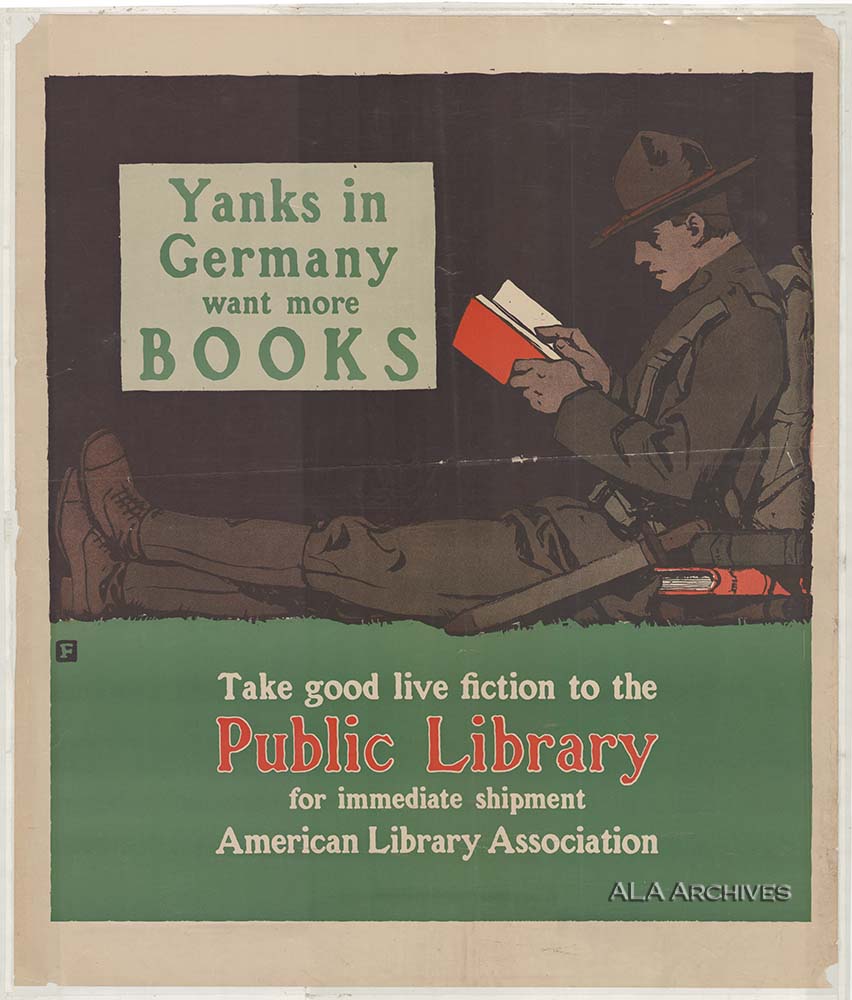 Poster text reads: Yanks in Germany Want More Books; Take good live fiction to the Public Library for Immediate Shipment; American Library Association