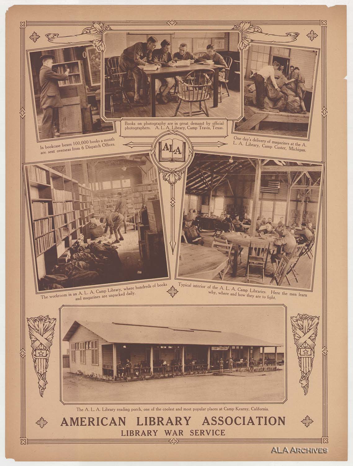 World War I poster with 6 scenes of camp libraries and soldiers using them.