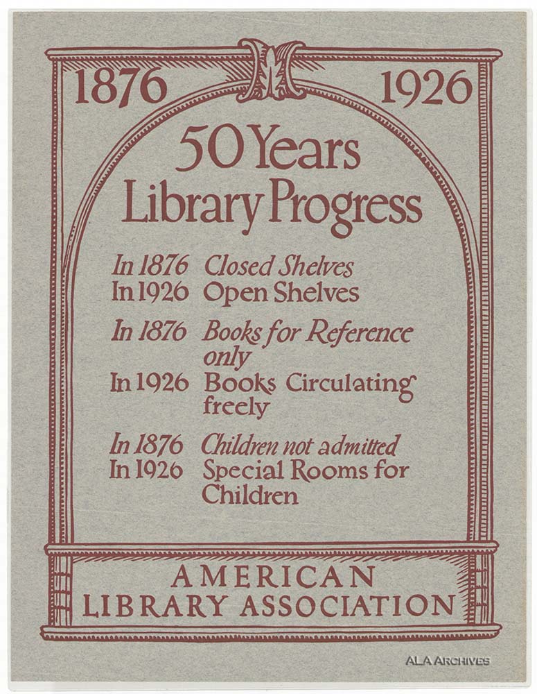 Poster text reads: 1876-1926; 50 Years Library Progress; In 1876 Closed Shelves, In 1926 Open Shelves; In 1876 Books for Reference Only, in 1926 Books Circulating Freely; In 1876 Children Not Admitted, in 1926 Special Rooms for Children; American Library Association