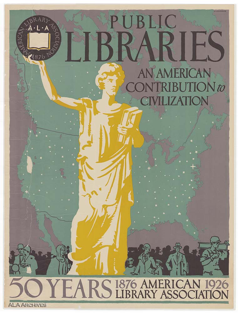 Poster text reads: Public Libraries: An American Contribution to Civilization; 50 Years; 1867-1926 American Library Association