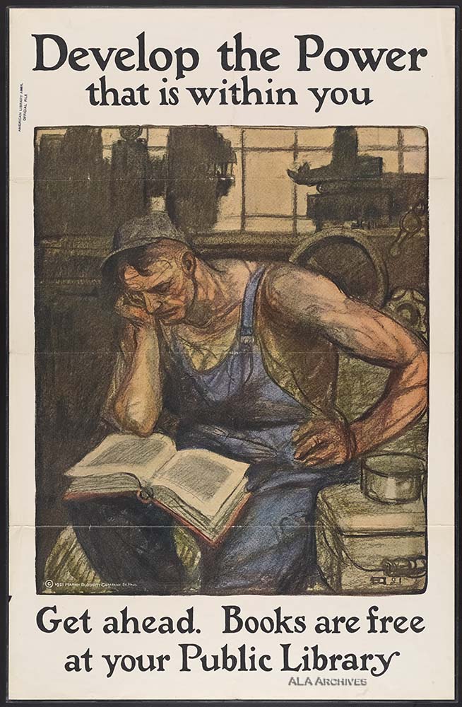 Poster promoting reading and the public library, depicting a male factory worker reading on his lunch break. Printed by the Harvey Blodgett Company.