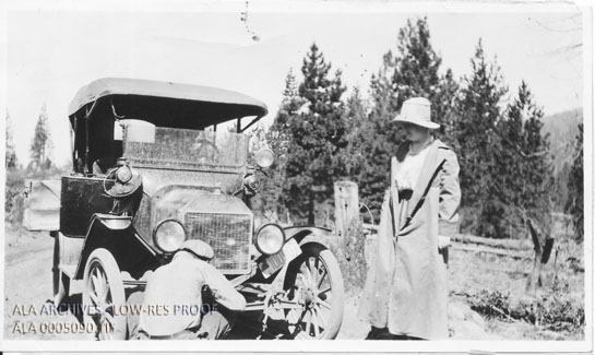 Caption reads: "The Siskiyou County Librarian watching her driver delving into the mysteries of a Ford that refuses to go. She travels hundreds of miles by auto over mountain grades visiting the county free library branches. Some of the branches are so remote she has to leave the machine and ride on horseback over the trails."